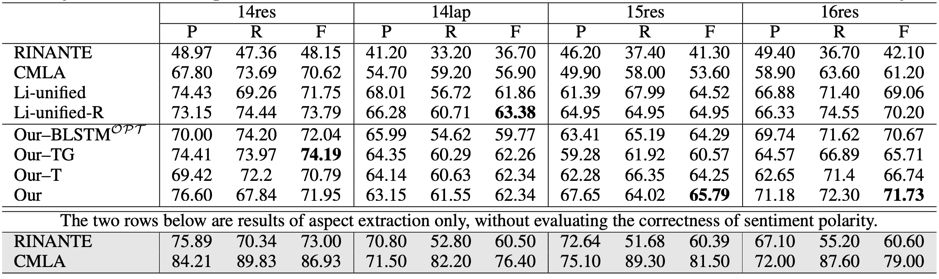 实验上,我们对模型的两阶段分别进行了验证。我们首先针对一阶段 unified aspect extraction 和 sentiment classification 进行了验证,结果如下表。