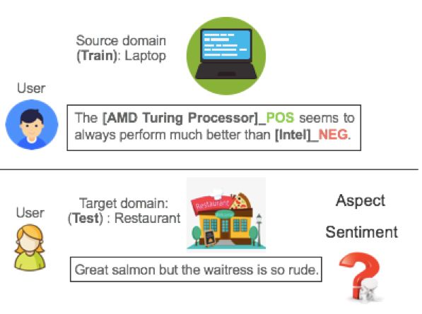 如下图所示,在笔记本电脑源领域(source domain),我们有大量的标签数据,即用户评论中标注了所有出现的评价目标以及其情感倾向([AMD]B_POS [Turing]I_POS [Processor]E_POS, [Intel]S_NEG),对于餐馆目标领域(target domain),只有无标签数据,即不标记任何出现的评价目标以及对应的情感。Trans-E2E-ABSA 需要迁移笔记本电脑领域的学习知识来帮助餐馆领域进行的评价对象以及情感的预测。