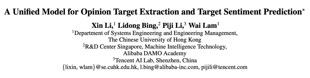 1. A Unified Model for Opinion Target Extraction and Target Sentiment Prediction. In AAAI 2019.
