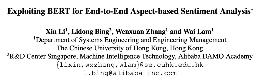 2. Exploiting BERT for End-to-End Aspect-based Sentiment Analysis. In EMNLP W-NUT Workshop 2019.