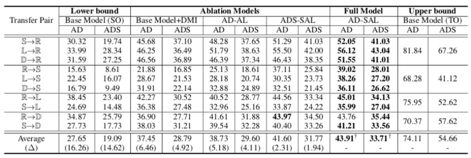 2. 有 SAL v.s. 无 SAL:结果可见 Base Model+DMI 与 AD-SAL 的差别;