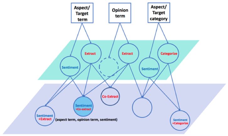 从目标识别角度,针对 aspect term 和 opinion term,存在抽取问题;针对 aspect category,存在分类问题(假设预定义 aspect categories)。从情感分析角度,对 aspect term 和 aspect category 存在情感分类问题。这些原子任务如下图中间层所示。注意,一句评论里可能没有显示提及 aspect term,但同样可以存在 aspect category,比如“I was treated rudely.”讲的是“service”。