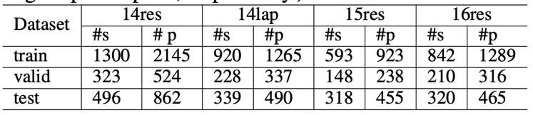 上例中包含两个 aspect-opinion 对:‘price’—‘best’和‘feature’ —‘newer’。我们同时也清除了少量的 aspect 标注和 opinion 标注有重合的数据。最终数据集统计如下: