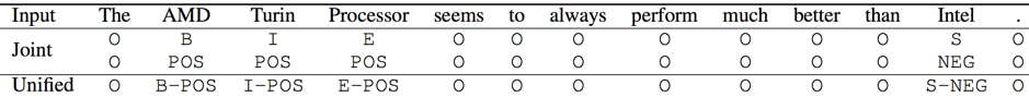 基于以上的考虑,我们设计了一种统一的标注模式并基于这种模式提出了解决统一 E2E-ABSA 序列标注问题的神经网络模型(unified 方案)。需要注意的是,工作