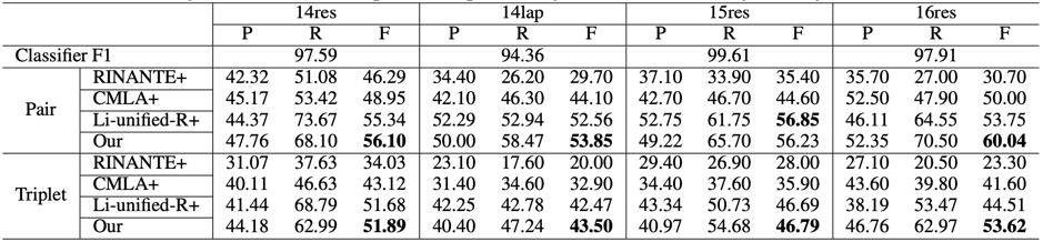 方法。另外我们发现 RINANTE 和 CMLA 的实验结果较原文均大幅下滑,为公平起见,我们增设了最后两行的对比实验,参考以原文同样的实验设置。结果显示效果显著上升,一方面证明了我们复现的可靠性,另一方面佐证了三元组抽取任务的高难度。