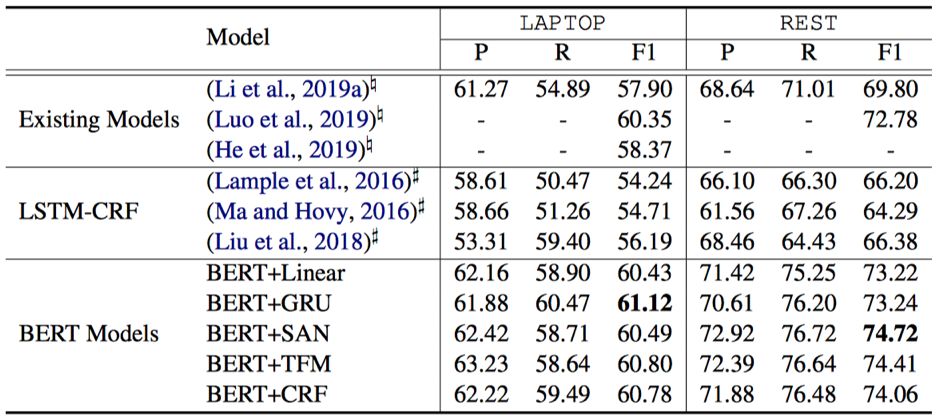 这些结果表明 BERT 所提供的的上下文相关的语义表示对于提升 E2E-ABSA 系统性能的重要性。一个很自然的问题就是结合我们的方案 1 和方案 2 结果会怎么样,目前正在实验中。