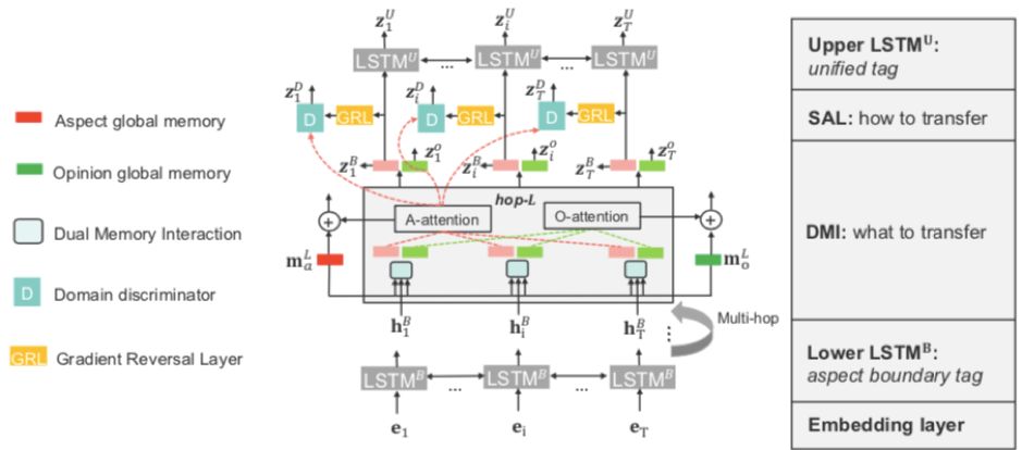 与此相反,我们提出了一种双内存交互(DMI)机制来自动捕捉评价对象与观点词之间的隐藏关系。DMI 通过多次交互 local memory(LSTM 隐状态)与 global 的评价对象 memory,观点词 memory 的方式,推理出每个词的关系表达,从而可用于序列标注任务下迁移的知识。