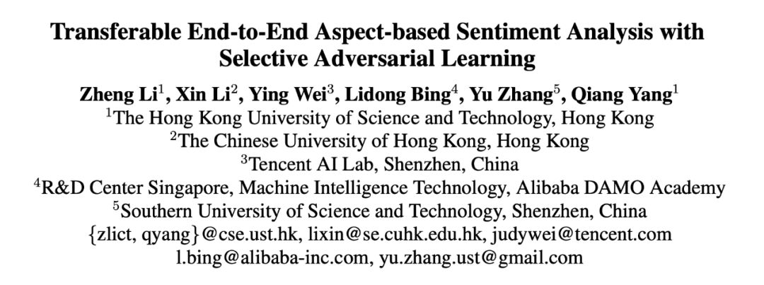 Transferable End-to-End Aspect-based Sentiment Analysis with Selective Adversarial Learning, In EMNLP 2019.