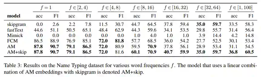 我们使用实体数据集,用于预测单词的细粒度命名实体类型,我们使用与第4.2节中相同的设置来训练逻辑回归模型,并对测试集中在WWC中出小于等于100次的所有单词进行评估。基于4.1节中的结果,AM仅改进了少于32次出现的单词的表示,我们还尝试了AM + skip的变体,在实验中用替换v(w,C),其中vw是w在skipgram中的词嵌入,