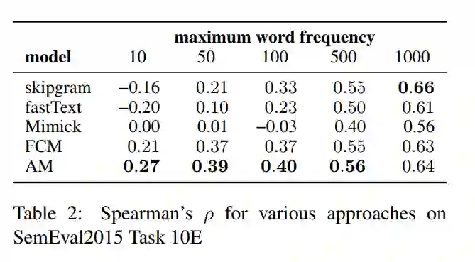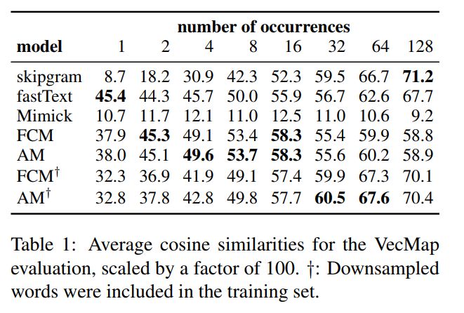 我们还尝试了一种变体,将降采样后的单词放入训练集中,这样一来,该模型就可用完全从无到有地学习这些单词,而且还可以利用他们的原始嵌入。因此我们希望该变体仅在单词不太稀疏的情况下才有用,即其原始嵌入已经具有不错的性能。表1显示了对于频次低于32的单词,FCMand AM的表现比所有基线都要好得多,而主要关注语法信息的Mimick的表现则相对较差。在给定四个或者更多上下文的情况下。AM给FCM带来了的持续的提升。在训练过程中包括降采样单词的变体在32次或更多次观察中仍然表现出胜过skipgram,但对于不那么频繁的单词,其表现却比默认模型差。
