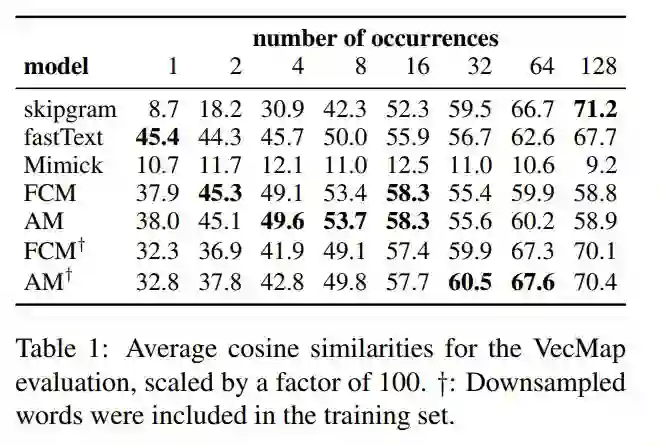 我们介绍了一种新颖的评估方法,该方法通过将WWC中的常用词降采样为固定的出现次数来显式评估低频和中频词的嵌入。然后,我们将从原始语料库获得的skipgram嵌入与通过在降采样语料库上训练的某种模型学习的嵌入进行比较。使用VecMap将两个嵌入空间转换为一个公共空间, 我们提供除降采样词外的所有词作为映射字典。从直觉上讲,模型从少量观察值推断嵌入的效果越好,其嵌入与该公共空间中的嵌入的相似性就越高。因此,我们通过计算模型嵌入和skipgram嵌入之间的平均余弦相似度来衡量模型的质量。作为基线, 我们在缩小样本的语料库上训练skipgram和fastText。然后我们在skipgram上训练Mimick、FCM和AM。