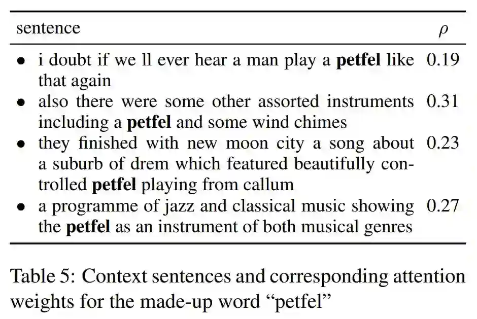 尽管在有许多可用上下文的情况下上下文注意的效果更加明显,但我们仍对CHIMERA的一个示例性实例进行定量分析,以更好地了解AM。我们考虑表5中出现的组成词“petfel”,是由“saxophone”和“harmonica”组合而来,该模型最多涉及句子(2)和(4),同样的,从那些句子获得的嵌入非常相似。此外,在所有四个句子中,这两个句子最适合于简单的平均模型,因为它们包含信息丰富的常用词,例如“instrument”,“chimes”和“music”。