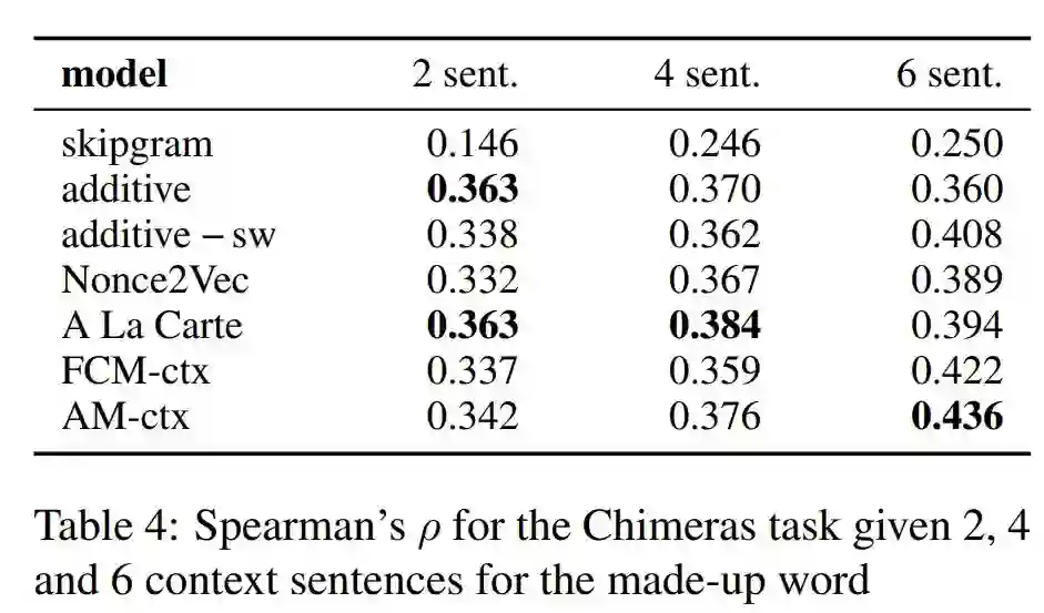 Chimeras(CHIMERA)数据集由成对单词和常规单词对的相似度得分组成。CHIMERA为每个虚构词仅提供六个上下文,因此对于评估我们的模型不是理想的。尽管如此,我们仍然可以使用它来分析FCM(无注意)和AM(有注意)的区别。由于虚构单词的表面形式是随机构建的,因此我们将自己局限于FCM和AM的上下文部分(称为FCM-ctx和AM-ctx)。使用Herbelot和Baroni(2017)的测试集,并使用FCM-ctx和AM-ctx将给定的相似度得分与相应单词嵌入的余弦相似度进行比较,以获取虚构单词的嵌入。表4给出了我们模型和各种基线的斯皮尔曼系数;我们没有添加Mimick的结果,因为它对新颖单词的结果完全基于其表面形式。虽然AM在2-4个句子中的表现比以前的方法差,但与目前发布的6个句子的最佳结果相比,它有了很大的提高。同时,上下文关注始终对于结果有所提高:无论上下文数量如何,AM-ctx的性能都优于FCM-ctx。