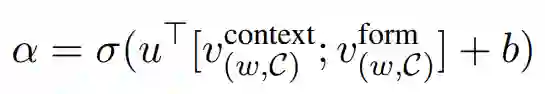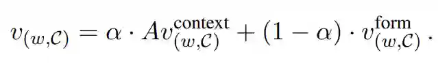 ,这是通过计算出两个不同的嵌入实现的,其中一种嵌入仅使用表面形态信息,而另一个则是使用了上下文信息。表面形态嵌入是通过对模型学习的一组n-gram嵌入进行平均而获得的;上下文嵌入是通过对c上下文中单词的所有嵌入求平均值而获得的。然后使用权重系数α和大小为d × d的矩阵A组合这两个嵌入,从而形成形态上下文嵌入。