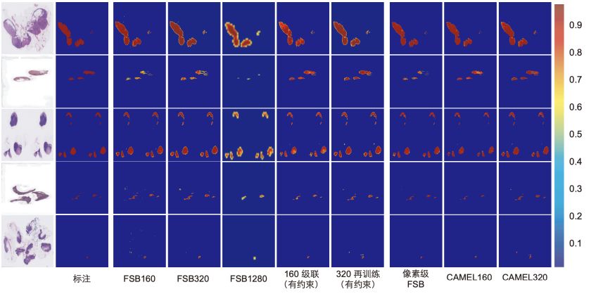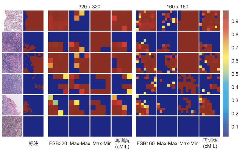 使⽤160×160图像块所获得的模型准确率高于320×320(见图5),说明了监督信息增强方法的有效性。我们在图6给出了不同模型在切片级数据上的预测结果。