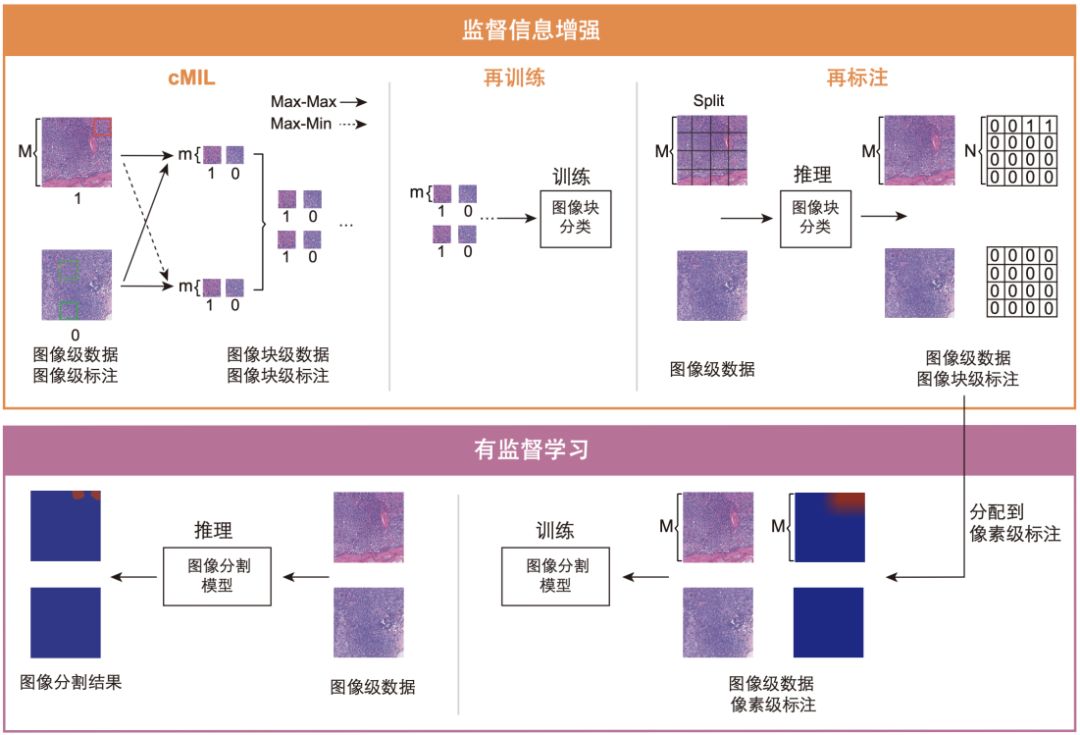 在之前介绍的算法中,在使用增强信息后的图像块数据进行分类器训练的过程中,我们并没有使用图像级别的标签信息。为了将图像级监督信息引入到模型的训练过程中,我们可以在训练图像块级别分类模型时,将分类器的网络结构设置为与cMIL相同,并复用cMIL的训练框架,进而将图像级的分类数据作为另⼀个有监督信息源参与到训练过程中。