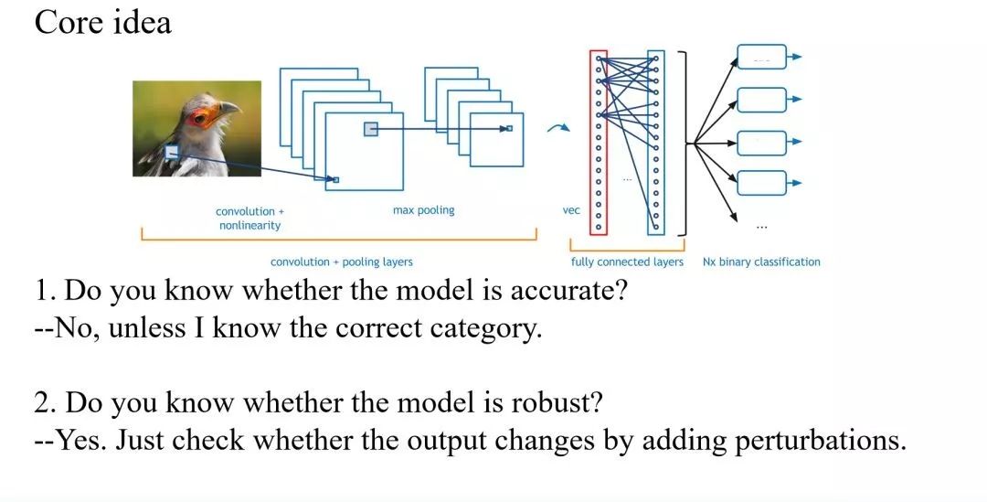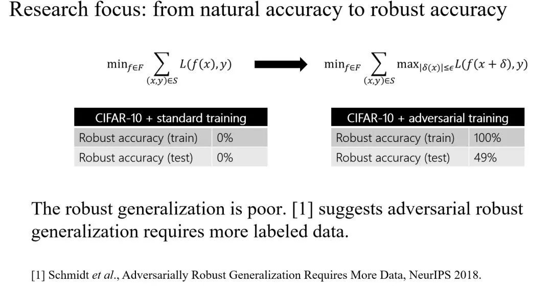 对于这个问题,今天大量的研究都是所谓的 attack 和 defense,用到了诸如 Algorithm training 等各种方法,试图增强深度学习网路的鲁棒性,但是效果比较差。更有甚者,虽然在这个方向已经有很多机器学习工作者开始展开理论研究,但不幸的是,直到今天大量的理论研究给出的都是负面的结果,例如《Adversarially Robust Generalization Requires More Data》,这是去年NIPS上发表的一篇很有代表性的论文,它证明了如果想要使神经网络对于对抗样本是 robust,那么必须要有非常多的 training data,即如果想要达到正常的 accuracy,所需要的训练数据量可能要有一个指数的增长。