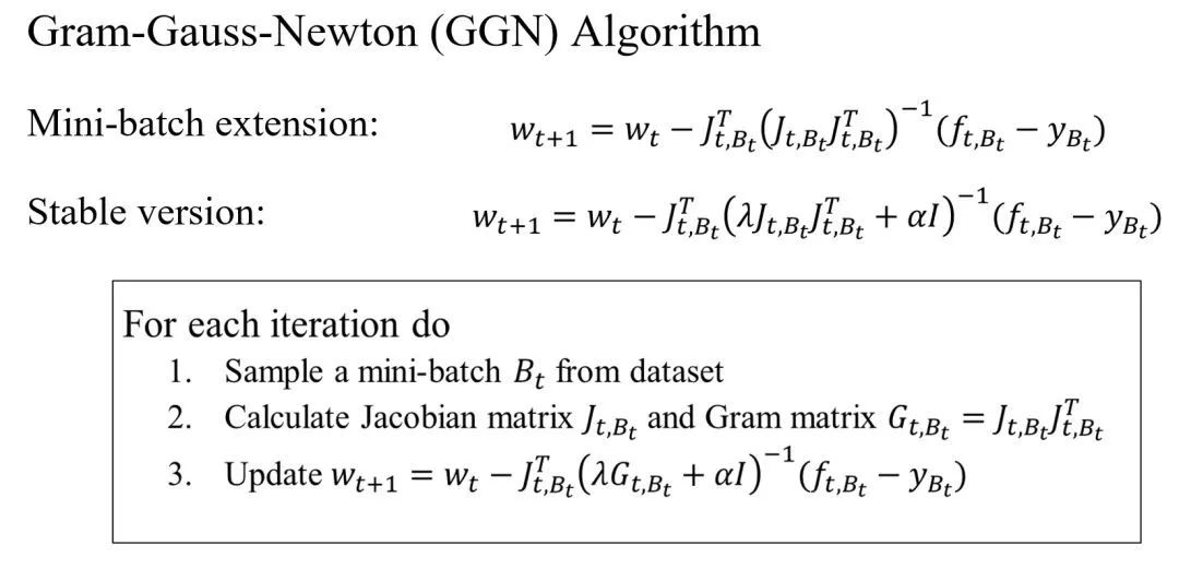 从理论上可以证明,其所提出的 Gram 高斯牛顿方法(Gram-Gauss-Newton ,GGN))具有非常好的性质,其一,是该方法的二次收敛速度极快,为双对数,迭代轮数非常少;其二,是可以用求伪逆的办法证明每一步的迭代计算量,相比于 SGD 只有非常小的 overlap。故而从理论上看,用 GGN 比 SGD 明显具有更大优势。