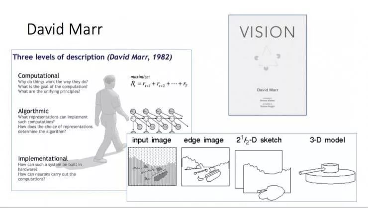 David Marr 在其 80 年代的著作《视觉》一书中提出了计算机视觉的几层构架,描述了视觉的抽象过程,提出对于输入图应该先检测边缘,形成 2.5 D sketch,然后再恢复 3D。但 MIT 教授 Marvin Minsky 在谈及他的这一构想时表示,这个理论很好,但是忽略了核心问题的研究——如何表述一张图像。