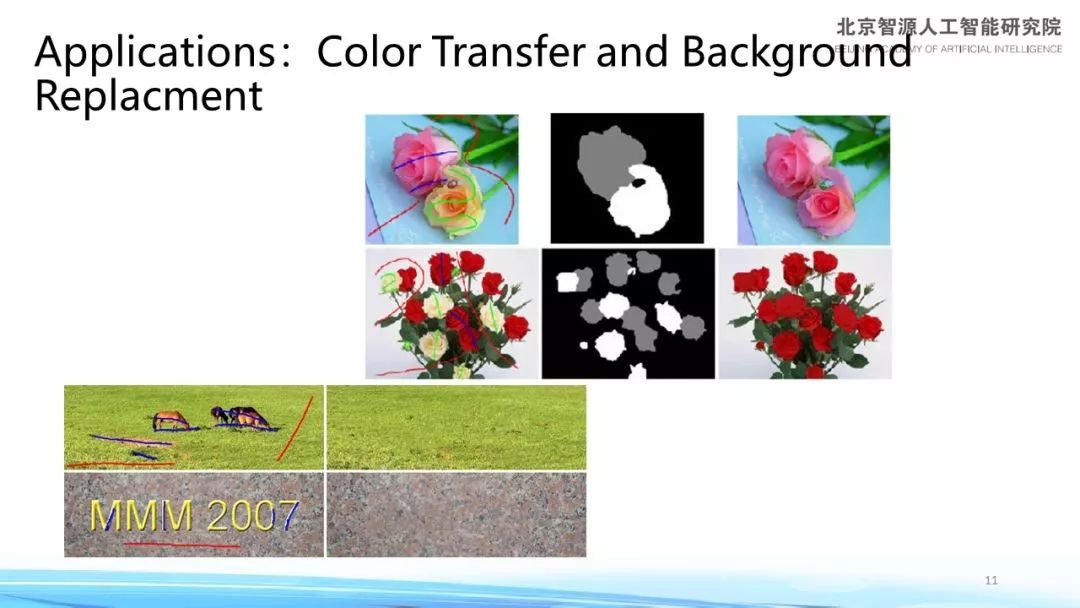 在此基础上,图像分割在视觉领域中还有很多有趣的应用,例如要把两朵玫瑰进行分割并且改变其中一朵玫瑰的颜色,或是把草地上的动物抹掉进行背景填充,这都属于半监督学习的范畴。