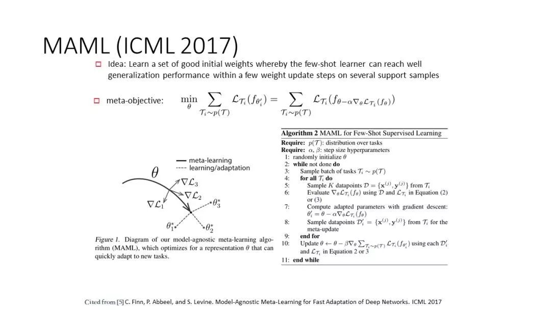 MAML 算法是一种经典的基于元学习思路去解决 few-shotlearning 任务的算法。将每个 few-shotlearning 任务视为一个 task,那么 MAML 的思路是学一个兼顾众多独立 task 的模型参数初始值,以期能在新的 task 的几个样本上只需经过数步的 fine-tune 操作就能使模型在该任务上达到较好的泛化性能(如左上图,三个方向代表三个不同的 few-shotlearningtasks)。