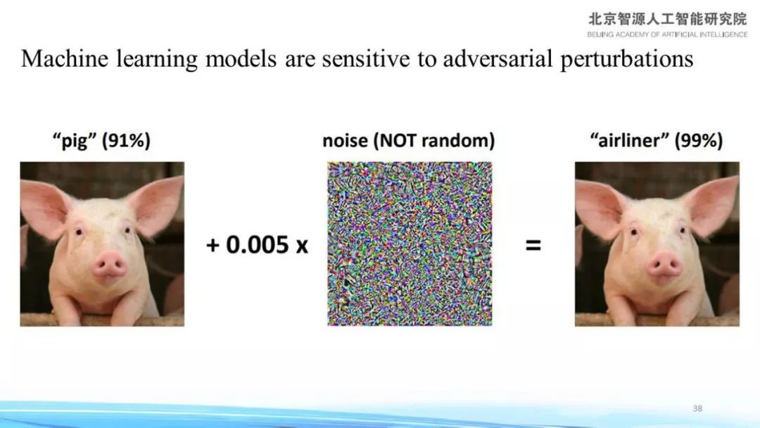左边猪的图像加一点非常小的noise (noisy image),但将此处的noise乘以0.005后再进行叠加,从而得到右图,人眼无法判断出左右两张图的区别,但是Neural network可以识别出左图为“猪”,同时却又得出右图跟“猪”毫无关联的结论,这是眼下深度学习遇到的一个很大的困难。
