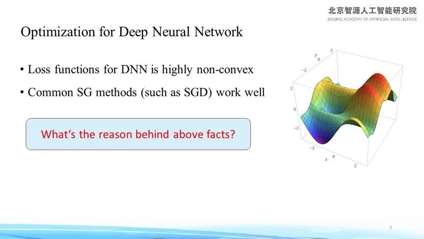 如上图所示,右侧图像是我们在思考神经网络训练做类似优化问题时的自然反映。从Optimization角度来看,神经网络的优化是一个高度非凸的问题,图上有坑坑洼洼的结构,每个坑里面都是一个局部的最优点。针对这样一个高度非凸的问题,从一个随机点出发,沿着梯度下降的方向,很容易就走到一个局部最优点。这是过去经典的非凸优化理论所经常提及的,除非问题本身具有很强的特殊性。