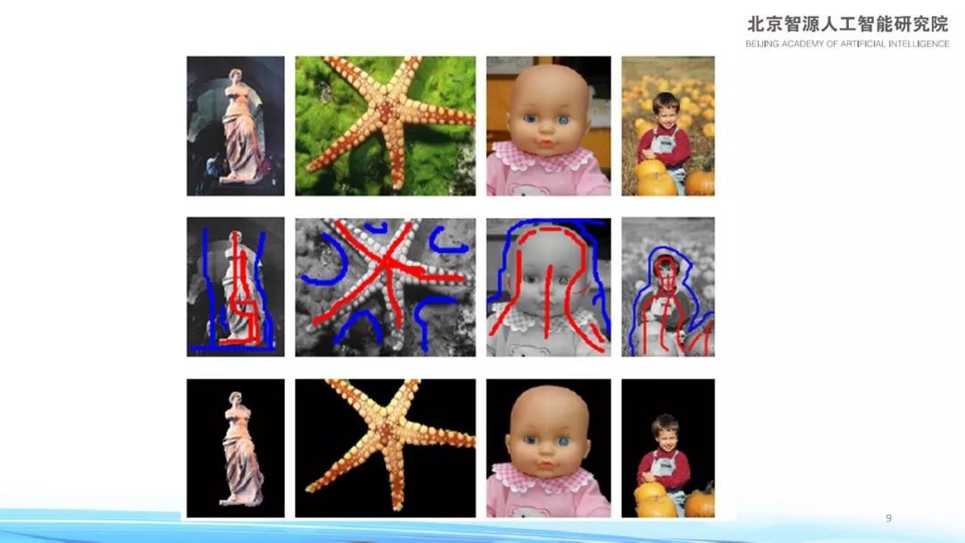 图像分割的工作可以用下图来进行说明,假设需要将图中雕塑从图像分形里抠出来,看似比较困难,但在半监督情况下可以实现——在中间一排,用鼠标左键划线,告诉计算机这是想要的地方;用右键划蓝线,告诉计算机这是不想要的地方,然后进行分割。从机器学习的角度看这属于半监督学习,从视觉的角度看这是交互,交互是图像分割。