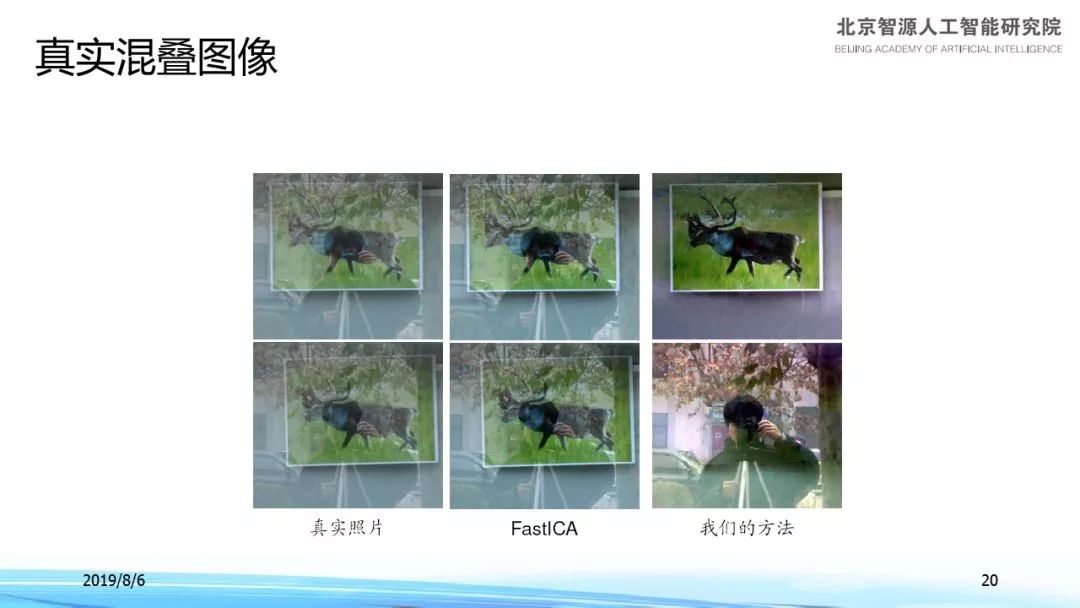 假设我们面对一面玻璃,玻璃另一边有一个张贴画,我们在这里拍那个张贴画,所以拍的时候(如上左图),我们既可以看到张贴画的图案,同时也可以看到拍摄人自己的反光,所以这是一个很真实的图像,我们得到两张图像之后可以做分离。中间那一列用经典的方法做就完全做不到,用我们的方法就可以把这两张图像分离开,这是我们第一次在真实图像上尝试。