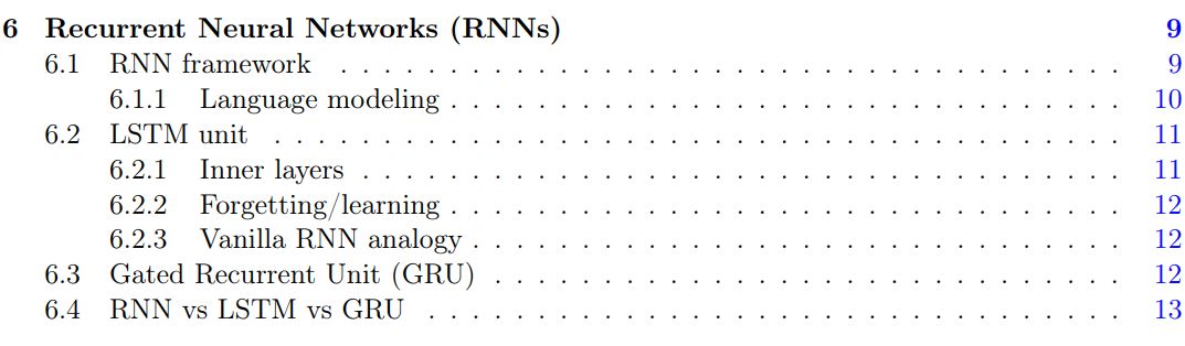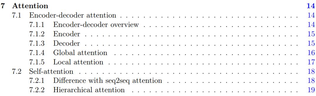 整个综述文章分为七章,我们仅会展示第七章的编码器解码器架构与注意力机制。其余关于卷积神经网络和循环神经网络的具体内容可查阅原文章,以下展示了整篇综述文章的目录: