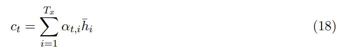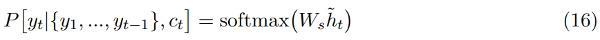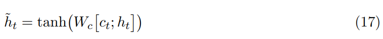 其中 h_t tilde 为注意的隐藏状态,它的计算表达式为: