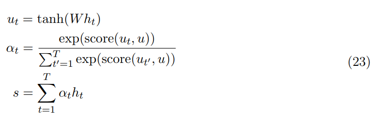 如下公式 23 所示,隐藏向量 h_t 首先会传递到全连接层。然后校准系数 α_t 会对比全连接层的输出 u_t 和可训练上下文向量 u(随机初始化),并通过 Softmax 归一化而得出。注意力向量 s 最后可以为所有隐藏向量的加权和。