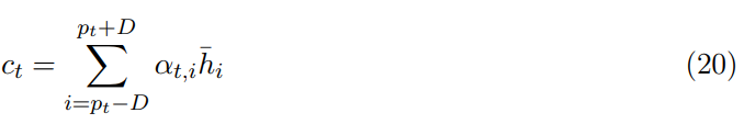 D 是开发者指定的超参数,位置 p_t 为窗口的中心,它可以设置为 t(单调性校准)或者由可微分机制确定(预测性校准),其中预测性校准基于前面生成的目标语单词信息 {y_1, ... , y_t-1},即储存在 h_t 中的信息: