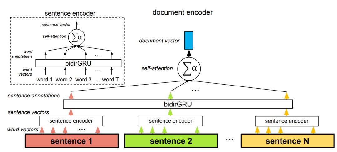 图 14 展示了一个很好的案例,它表示自注意力机制为什么在实践中非常有用。在该架构中,自注意力机制共使用了两次:在词层面与在句子层面。该方法因为两个原因而非常重要,首先是它匹配文档的自然层级结构(词——句子——文档)。其次在计算文档编码的过程中,它允许模型首先确定哪些单词在句子中是非常重要的,然后再确定哪个句子在文档中是非常重要的。
