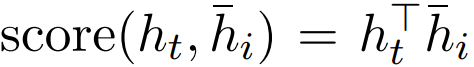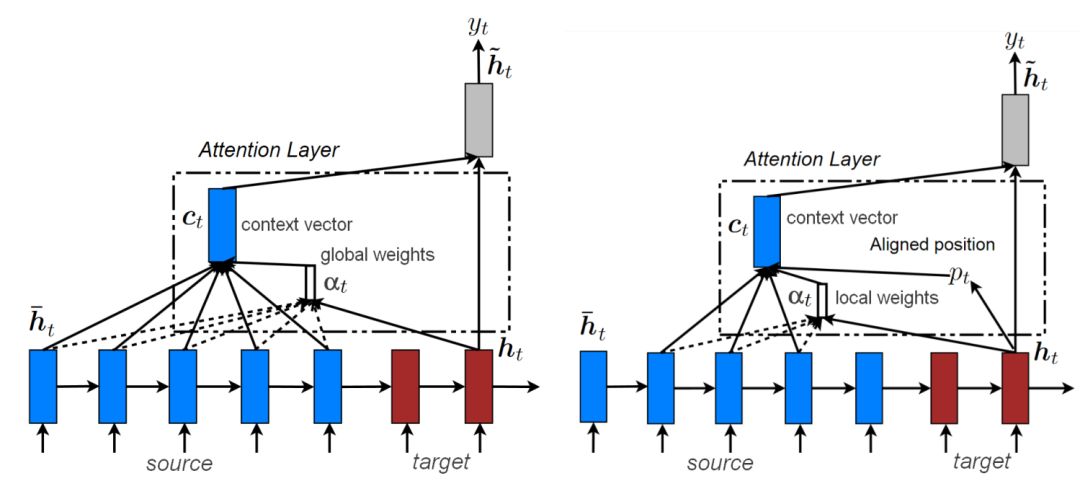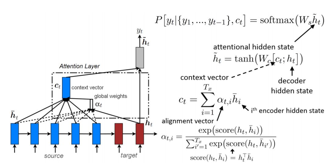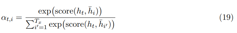 换而言之,α_t 为所有原语隐藏状态上的概率分布,即所有α_t 都在 0 和 1 之间,且加和为 1。α_t 表明原语句子中哪一个单词对预测目标语下一个单词最重要。score() 在理论上可以是任何对比函数,Luong et al. [20] 通过点乘试验该函数