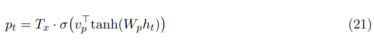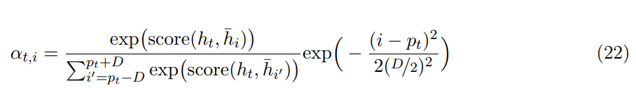其中 T_x 为原语句子的长度、σ为 Sigmoid 函数、v_p 和 w_p 为可训练参数。校准权重的计算方式与全局注意力相同(公式 19),只是加了一个均值为 p_t、标准差为 D/2 的正态分布项: