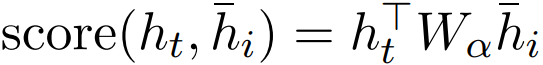 校准向量(alignment vector)α_t 需要先对当前目标语隐藏状态 h_t 和所有原语隐藏状态 h_i bar 之间做校准运算(score()),然后再对运算结果应用 Softmax: