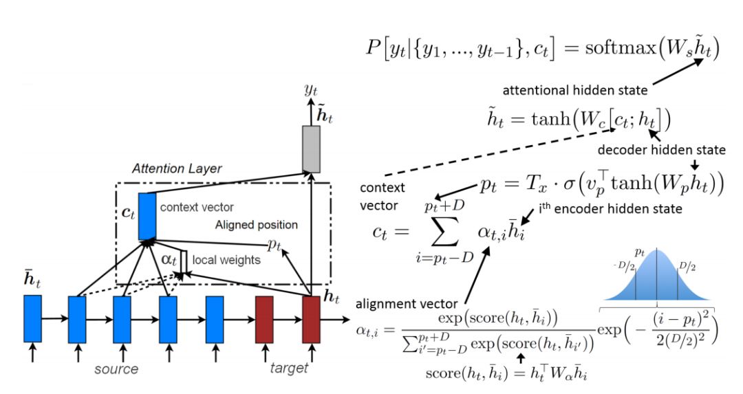 每生成单个目标词都需要考虑原语句子的所有词在计算上是非常昂贵的,也不是必需的。为了减少这种问题,Luong et al. [20] 提出了一种仅关注固定窗口大小 2D+1 的局部注意力机制: