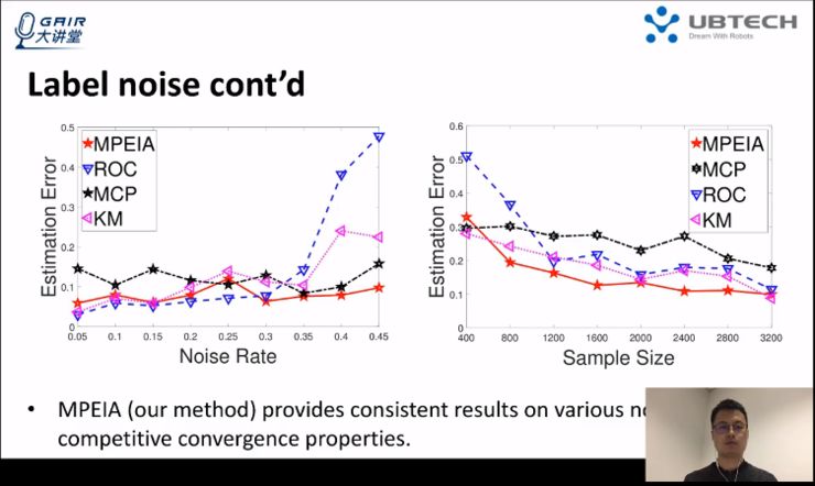 最后,我们通过一个实验来验证。训练数据和测试数据的分布均由两个高斯分布混合而成,但比例不一样。这里 beta 是测试数据 P^te(Y) 比上训练数据 P^tr(Y) 的比例,可以看出在不同的 beta 时(图中最左),我们的方法能够得到比较一致的结果。在训练数据中有不同的噪声大小的时候,我们的方法表现也是比较一致的(图中)。可以看出当训练样本逐渐增大,我们的算法也逐渐收敛到最优的解。而对比的方法都出现了比较大的误差,甚至有时候是错误的(图中最左)。通过这个实验可以验证出在该问题中我们的方法的有效性,也可以看出 MPE 在这个问题中的延伸应用。