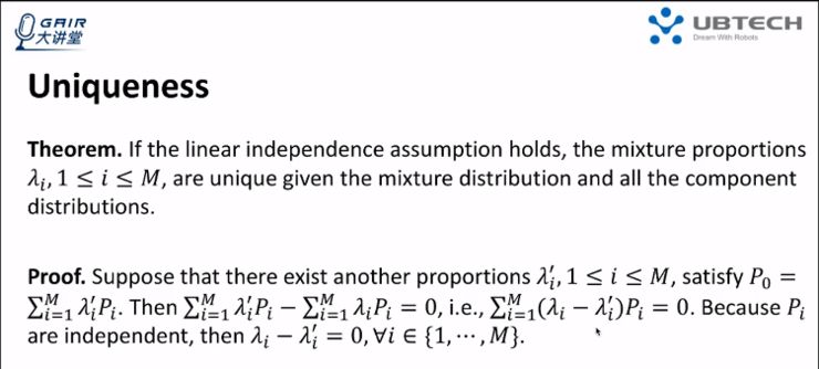 在线性独立的假设条件下,能够证明出这个混合比例的唯一性,假设 P0 是由 P1 到 PM 的线性组合而成,而且组成分布满足线性独立假设。如果给定这个 P0 和所有组合分布的情况下,该比例是唯一的。证明非常简单:利用反证法(和线性代数里面证明的方法一致)证明。假设存在另外一组系数使得这个混合同样成立,通过两个不同组合的系数相减等于 0,借此可以进行推导。具体推导讲解,大家可以回放视频至第 19 分钟查看。