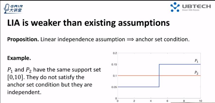 同时也可以证明线性独立假设弱于 anchor set condition 假设。同样给一个例子来简单说明,比如说右图这两个分布,我们可以看出这两个分布的 suppose set 都是 0 到 10,但是这两个分布显然是不一样的,所以它们俩不符合 anchor set 的假设,但它们俩线性独立。