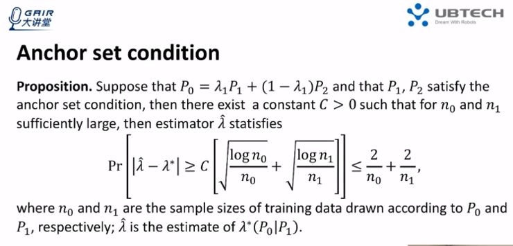 我们可以简单通过上图示例的右边部分来了解,两条黑线所标注的集合就是通常的 Anchor set,在这种情况下,如果拥有 Anchor set 的集合数据,比如有 P0 的数据和 P1 在 Anchor set 中的数据,其实就能通过 Anchor set 的数据来估计出 P1 的比例。