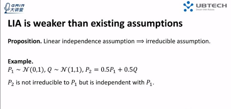 可以证明线性独立的假设弱于不可约假设,它可以推导出不可约假设,但是不可约假设不可推导出线性独立假设。这里不进行详细的证明,给一个例子:假设 P1 是正态分布,P2 也是另外一个正态分布,而 P2 是 P1 和 Q 的线性组合,可以看出假设 p1 和 P2 是不一样的两个分布,所以它们俩是线性独立的(根据前面一页的推论)。根据不可约的定律,可以知道 P1 和 P2 是可约的,因为 P2 表示成 P1 和另外一个分布 Q 的组合。这个例子中的两个分布是线性独立的,但是可约。