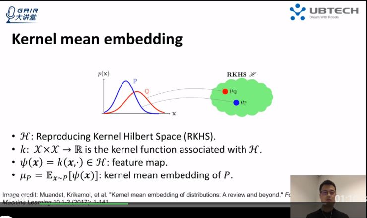 我们可以利用最大平均差异的方法来求出λi 的解,利用的定理为:如果两个分布它的最大平均差异是 0 的话,当且仅当这两个分布是同一个分布。所以最小化平方后的最大平均差异的值,就可以求出λi。但问题是我们没有 Pi 的表达式,不知道核均值嵌入到底是多少。