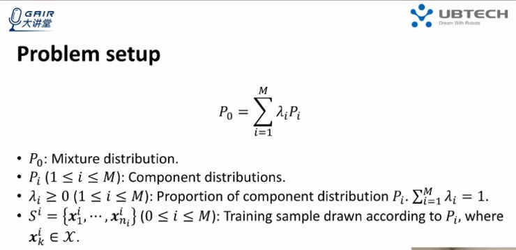 第一个 setting,是指假设只从混合分布 P0 中采样了一部分数据 S0 时,如何估计λi。其实没有任何组成分布的信息是无法完成这项工作的,所以往往要对这些分布加非常强的假设。在这种情况下,我们一般假设组成分布满足高斯分布的假设(当然也可以是其他分布假设),这就得到了我们通常所说的混合高斯模型。高斯模型可以通过 EM 算法来求解各个组成分布的均值和方差矩阵,同时也能求出λi。该模型的问题在于:利用 EM 求解混合高斯模型时,不能保证得到唯一解。
