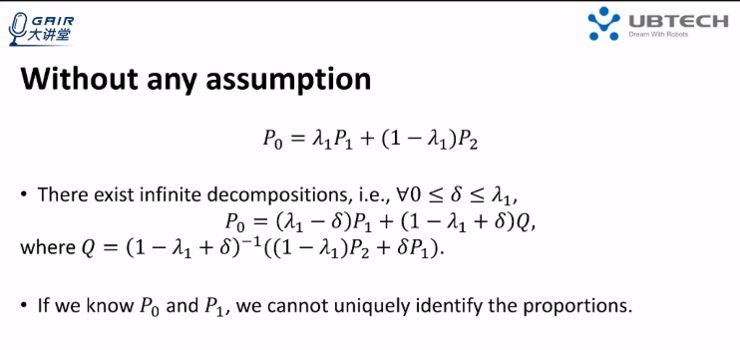 首先假设对这些分布没有任何假设的情况下,其实可以看出这个分布 P0,可以存在任意多的分解,比如把 P1 的一部分组合到 P2 之中,就可以得到一个新的分解。这样,如果只知道 P0 和 P1 的信息,我们是无法求得 P1 和 P2 的比例,因为这个比例可以是任意多的。