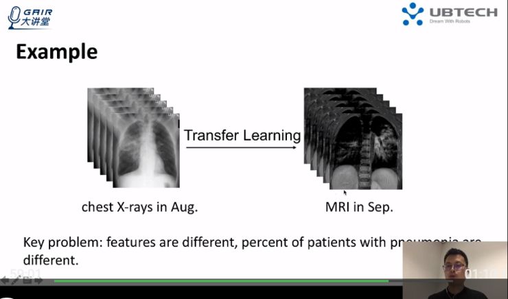 我们同样来这个例子,假设 8 月份的数据(已经标记好),由于某些原因标记出现了错误,而在 9 月份,得到了一些核磁共振图像,我们能不能在 8 月份的 X 光片成像中提取一些有用的信息来辅助核磁共振成像的最后分类?这个问题比较有意义,因为在现实医学生活中我们往往有很多可以辅助你的医学数据,这些数据往往很难标记,很多数据可能标记错误,我们希望用这些辅助数据来学习到一个新的病例中,帮助一个新的病例来提取一些不便的信息,帮助它们的学习,这个问题我们该如何来解决?