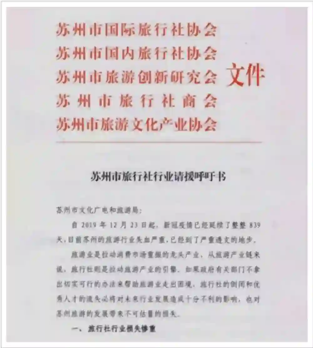 时隔几日,苏州市国际旅行社协会、苏州市国内旅行社协会、苏州市旅游创新研究会、苏州市旅行社商会、苏州市旅游文化产业协会联合发布了一份《苏州市旅行社行业请援呼吁书》,揭开了旅游行业惨淡的现实。