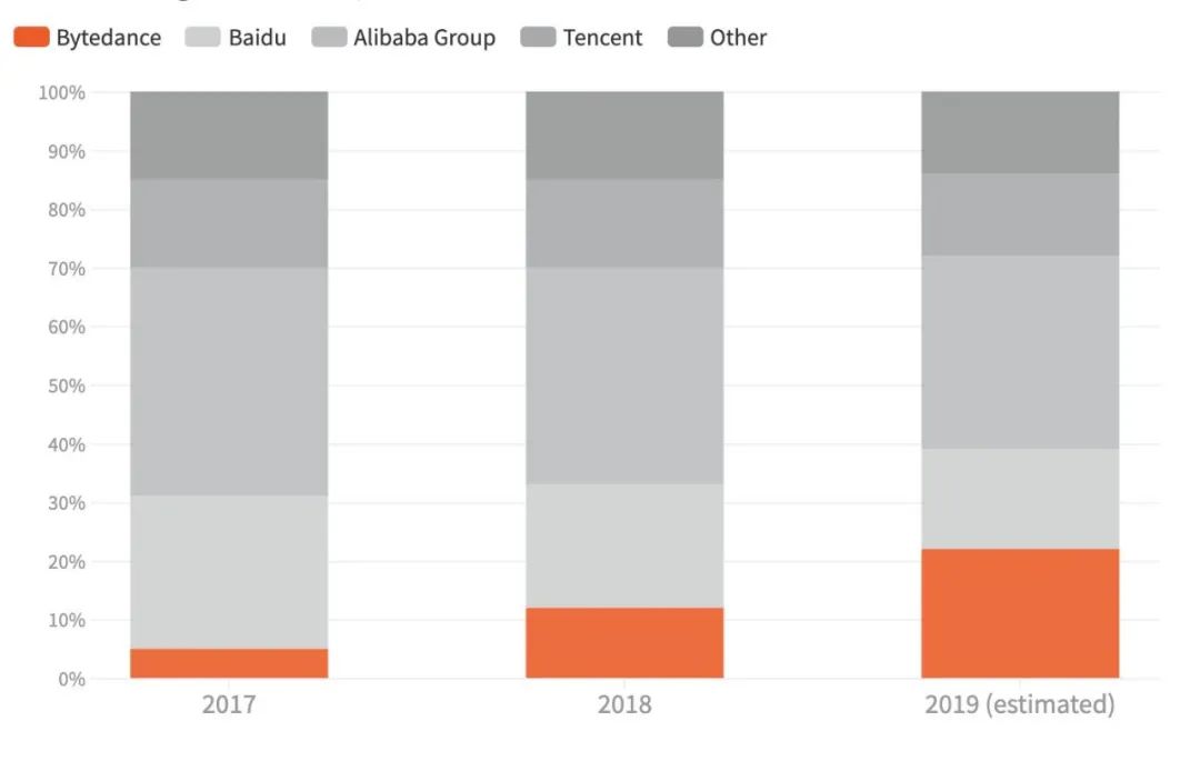 过去三年字节跳动的广告市场份额从5%上升到22%