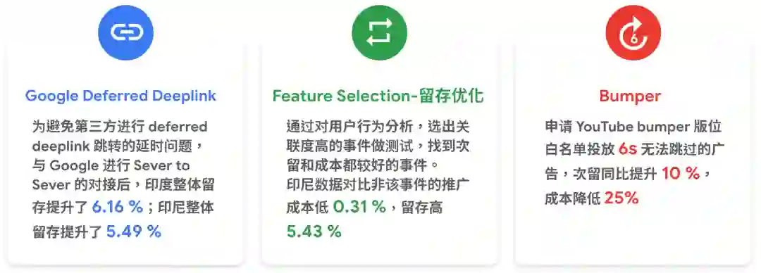 在与 Google 的合作中,前期: 从谷歌获得数据上的支持和方向上的判断,帮助更好地选择市场,辨析素材方向以及产品的卖点;中期: 来自谷歌的流量生命周期长,收获更高质量用户;后期支持: 对团队进行产品培训,开放新工具的白名单优先尝试,实现了以下效果: